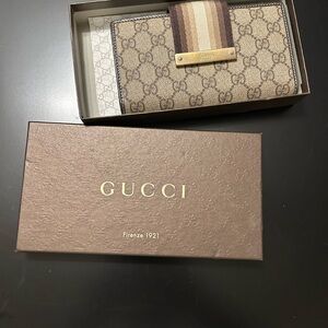Elegant Gucci wallet with signature GG design. Features tan and brown tones.