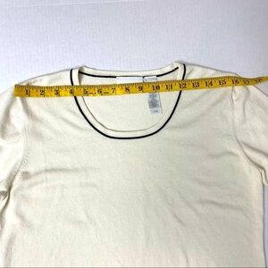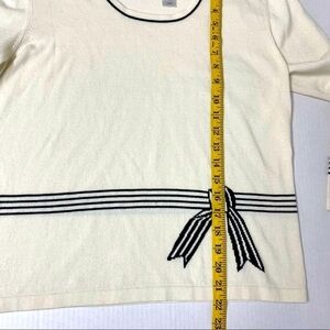 This sweater is preowned in an excellent condition. There are no rips, tears or stains. Approximate measurements are all pictured. It features line detailing on the cufda and bow detailing on the body.