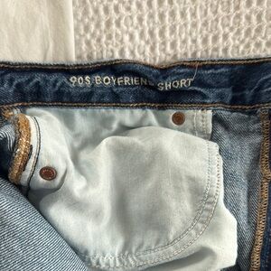 These American Eagle Outfitters jean shorts showcase a modern distressed look with a medium-dark blue wash. The raw, frayed hemlines and significant distressing add a casual, worn-in vibe perfect for everyday wear. The subtle fading patterns enhance the depth of the blue color, making them a versatile addition to any wardrobe.