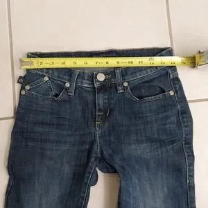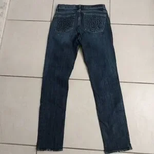 jeans. Made from a comfortable blend of spandex and cotton, these pre-owned jeans feature a dark wash and straight leg style, perfect for any season. The low rise waistline and button closure provide a flattering fit, while the 5-pocket design and embroidered accents add unique touches. These jeans are easy to care for and machine washable, making them a versatile addition to your wardrobe. Show off your college, city, retro, and logo-themed style with these petite-sized jeans.