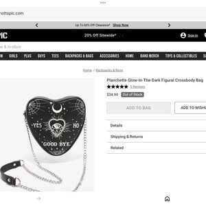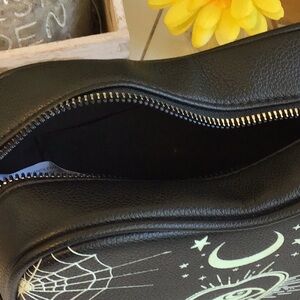 This NWOT Hot Topic Glow-in-the-Dark Figural Heart Shaped Crossbody has hardware of silver tone, shell is non-leather/lining is 100% Polyester and it closes w/a large tooth metal zipper. Inside is a 3 1/2”H open pocket and its s/s is chain/1”W strap. But its glow-in-the-dark feature is what makes it so fun!