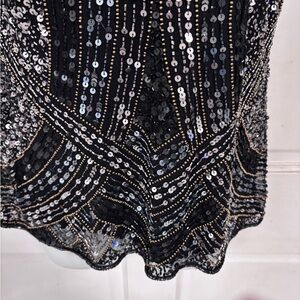 Macys 28th and Park short sleeve Top has a very sheer backing and is covered with sequins and tiny beads. Black silver and gold. Gorgeous design. Fancy evening wear.