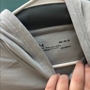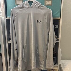Light gray pullover hoodie with front pocket. Features Under Armour logo on chest.