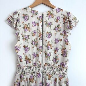 Short skort, romper, ruffles, tiered skirt, floral, crossover v neckline, short flutter sleeves, exposed back zipper, smocked waistline, fit & flare silhouette.