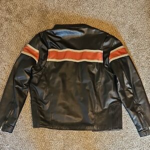 This Wilsons Leather bomber jacket features a striking black and red color scheme, embodying a classic varsity style. Its sleek design and premium leather construction make it a standout piece for any occasion.