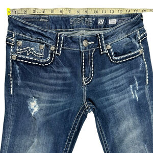 These are pre-owned Miss Me denim jeans, size 31. The jeans are a dark wash with white stitching details on the pockets and seams. They feature a standard five-pocket design and a button-and-zip closure. The material shows some intentional fading and distressing. The inseam measures approximately 33 inches, and the waist is approximately 16 inches across when laid flat.