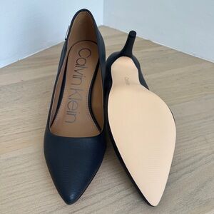 These sleek blue heels from Calvin Klein feature a classic pointed-toe design and a comfortable 3” kitten heel, perfect for both professional and formal settings. Crafted with a minimalist aesthetic, they offer a timeless silhouette that complements any outfit with elegance and sophistication. Never worn.
