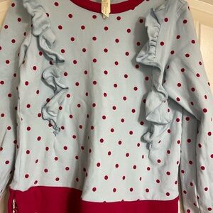 Stylish Matilda Jane heart to heart dewdrop mixed print sweatshirt dress.Red polka dots on a blue background. Features a comfortable fit.