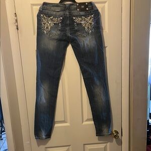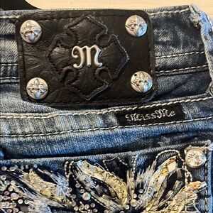 These Miss Me skinny jeans feature a classic blue wash with natural fading and whiskering, offering a stylish and lived-in look. The distressed details on the thighs add a touch of casual flair, while the tapered leg ensures a sleek silhouette. The back pockets have intricate embroidered flowers on them, surrounded by jewels. Perfect for everyday wear, these jeans combine comfort with a modern edge. Size 28 on Miss Me jeans, is equivalent to a size 6- Only worn 3xs- Dry cleaning is recommended