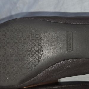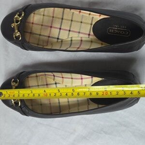 These Coach Leona flats feature a sleek very dark brown, almost black exterior complemented by gold-tone hardware across the toe. The interior boasts a stylish plaid lining, adding a touch of sophistication to their timeless design. Perfect for everyday wear, these flats offer both comfort and elegance. Pre-Loved. Size 8. Measurements are approximate.