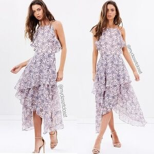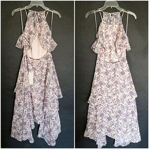 Keepsake Lovers Holiday Floral Ruffled Open Back Lace Trim Asymmetrical Dress
