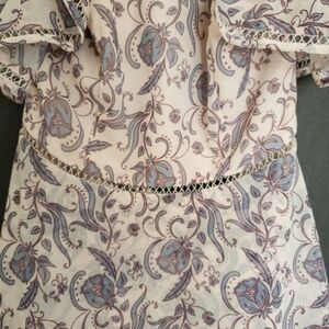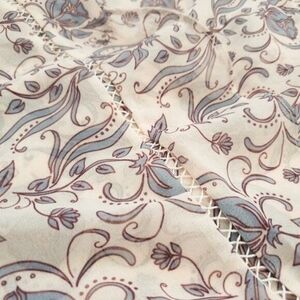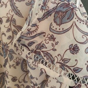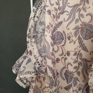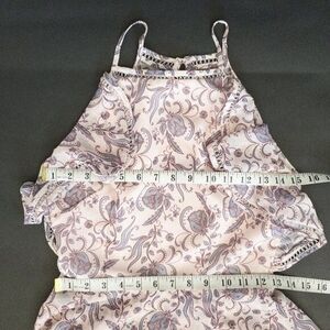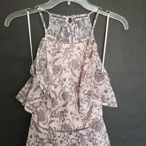 Lightweight georgette flaunts a stunning floral design throughout. Cascading ruffles give a delicate feel. Ladder lace trim is featured throughout. Open-back design with button-loop closure at nape and lower back. Concealed back zip closure. Tiered skirt. Asymmetrical hemline. Lined. 100% polyester; Hand wash and dry flat.