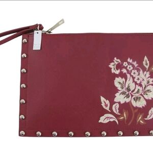 This elegant clutch from White House Black Market features a striking red hue adorned with delicate white floral embroidery and silver-toned studs. Its sleek, rectangular design is complemented by a matching wrist strap, making it a perfect accessory for any sophisticated occasion.