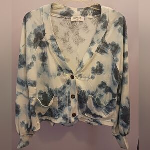 Stylish blue tie-dye cardigan and shorts set. Features button-up cardigan and drawstring shorts with front pockets.