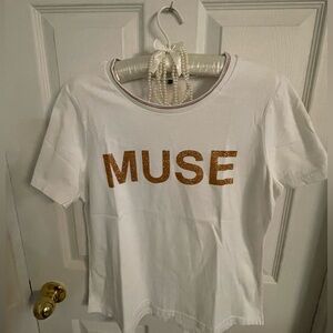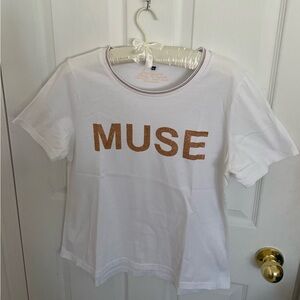 Short sleeve white tee with gold 'MUSE' lettering. Casual and stylish. Perfect for everyday wear.