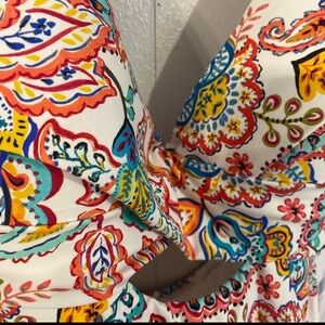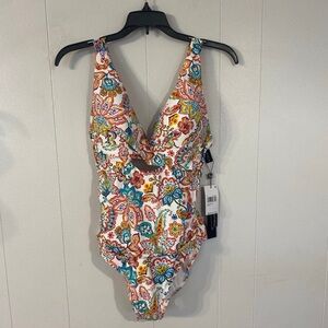 SHAPE-SLIMMING DESIGN — Shirring and tummy control offers up a shape-enhancing silhouette that instantly masks worry areas. Radiate bohemian charm with this cross front keyhole one piece swimsuit adorned in a captivating white multicolored gypsy floral print, evoking the free-spirited essence of wanderlust and adventure. The fusion of vibrant hues against the crisp white backdrop creates a visually striking ensemble that captures the carefree beauty of a nomadic journey. NWT size 10.