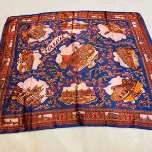 Elegant scarf featuring a Paris motif. in a vibrant, rich blue and orange. Iconic and historical landmarks of the most beautiful place in the world.