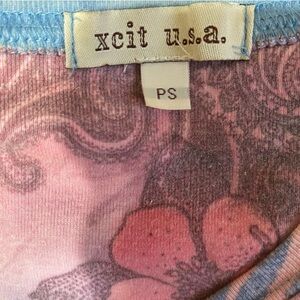 This artistic blouse showcases a stunning blend of blue and pink hues with a graphic design that includes ornate scrollwork and delicate floral elements. The 3/4 sleeves and vintage-style finish add a touch of elegance to this top, making it a standout piece in any wardrobe.