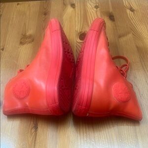 These Converse sneakers feature a striking orange color that covers the entire shoe, including the rubber sole, laces, and rubber upper. The high-top silhouette extends above the ankle, offering a classic lace-up front with metal eyelets. A matching orange Converse All-Star patch on the ankle adds to the bold and cohesive look. They are in good condition.