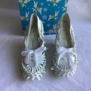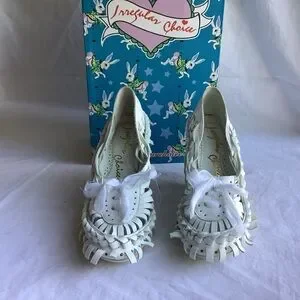 rare white leather wedge heels from Irregular Choice stand out with their distinctive design, combining elegance and creativity. The shoes feature a striking silhouette that adds a touch of flair to any ensemble, making them a perfect choice for those who love to make a statement.
