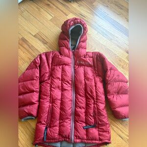 Experience warmth and style with this Patagonia puffer jacket, featuring a hooded design and down insulation for optimal cold weather protection. The jacket's quilted construction and matte finish offer a sleek look, while the classic Patagonia logo adds a touch of authenticity. Hood for extra warmth. Please see all photos for signs of use!