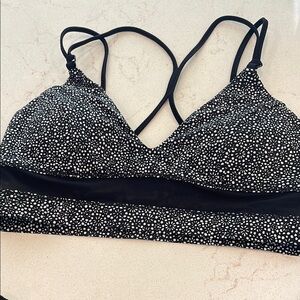 Sporty and stylish with a floral polka dot design. Bikini top is a sports bra style. Board shorts have a 2” inseam.