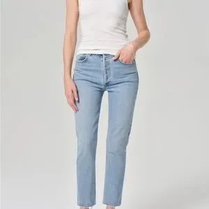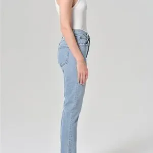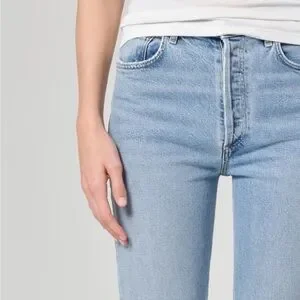 These Agolde jeans feature a classic straight leg cut in a clean blue hue, offering a modern cropped length that ends just above the ankle. The mid-rise fit and smooth denim texture provide a comfortable and stylish look for any casual occasion.