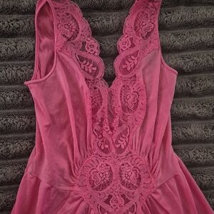 Elegant pink nightgown with lace detailing. Sleeveless design. Flowy and comfortable.