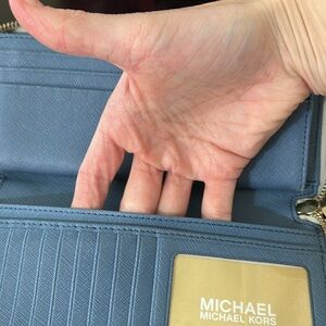 Wallet is in good used condition. Fun novelty travel decals with glitter details. Includes and airplane, ticket and sunglasses. Leather is in great condition with no stains, tears or rips to the leather on the interior or exterior. Zipper is fully functional. Includes original wristlet strap. Zipper pull and metal hardware on the wristlet strap is scratched. See photos for close up.
