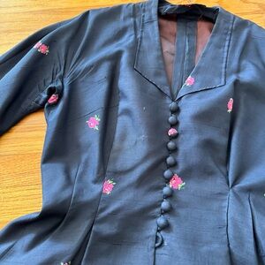 Pretty vintage 50’s silk button up tunic / top with peplum waist. Floral print. Buttons up the front. The colors are dark blue and pink. No label. The bottom button is missing. You could always just cut the bottom button hole off and then no one will know there was a missing button. There’s a tiny hole on the front, but still excellent vintage condition. Measures 31 inches long, 38 inch bust, 30 inch waist.
