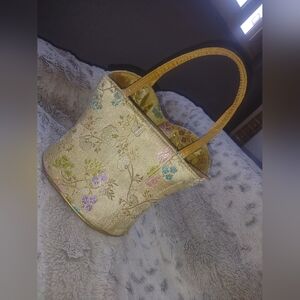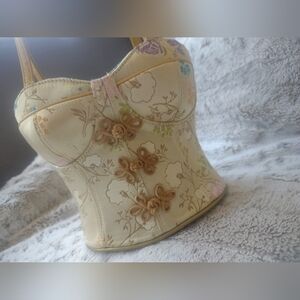 Elegant corset-style handbag with a floral design. Features a unique shape and vibrant colors, perfect for adding a touch of sophistication to any outfit. Very vintage and unique!! This handbag is truly art, lovely to sit on a table side or take it out on the town. Some interior discoloration, a zipper pocket inside and zipper closure on outside, very nice condition and gently used. Handed down to me and I would love to send it to someone who appreciates the unique beauty of it.