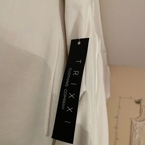 This stunning Trixxi dress features an asymmetrical ruffled design that adds a touch of elegance to its A-line silhouette. The sleeveless halter neckline enhances its modern appeal, making it perfect for weddings or cocktail events. Crafted in a crisp white, this dress exudes sophistication and style. NEW WITH TAGS, MISSING TAG WITH PROOF OF PRICE PAID.