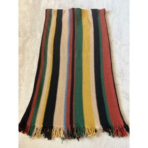 A vibrant striped knit skirt, perfect for adding a pop of color to your wardrobe. This eye-catching skirt features bold vertical stripes in a variety of hues, including red, green, yellow, black, and beige. The skirt has a comfortable elastic waistband and a playful fringe hem, adding a touch of bohemian flair. This skirt is ideal for casual outings, weekend adventures, or adding a unique touch to your everyday style.