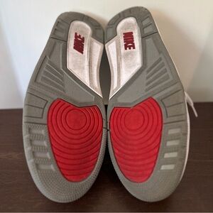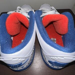 Stylish Air Jordan sneakers in white and blue. Features iconic design with red accents.