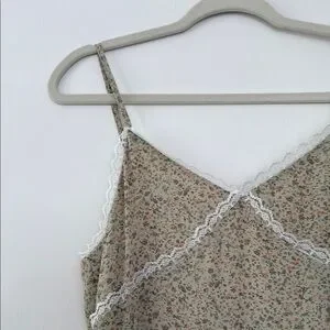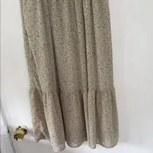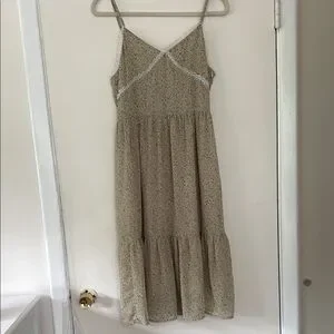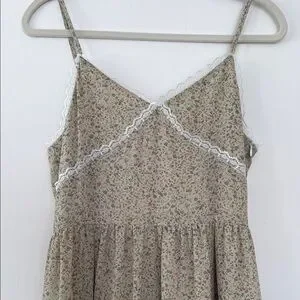 This sleeveless sundress in green and pink features a tiered, ruffled design with spaghetti straps. Its midi length and flowy silhouette make it perfect for casual or resort wear, offering a relaxed and stylish look for warm weather.