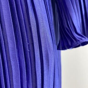 Purple satin (100% Recycled Polyester). Lining (100% Polyester). Column. Long sleeves. Crewneck. Back zipper closure. 58" from shoulder to hemline. 26" slit. Imported.