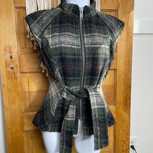 Stylish plaid vest by CAbi. Features a zip front and belted waist. Perfect for layering.