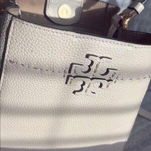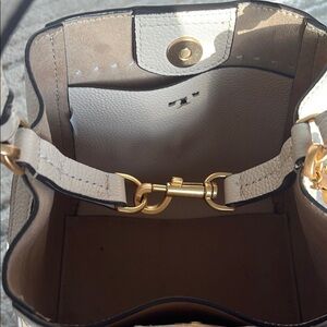 This Tory Burch mini bag in a sophisticated cream color is crafted from structured leather, featuring a minimalist design with the iconic logo on the front. Its versatile crossbody strap and top handles make it perfect for both casual and formal occasions, while the gold-tone hardware adds a touch of elegance.