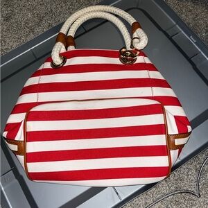 This Michael Kors tote features a striking red and white stripe pattern, perfect for a nautical-inspired look. Crafted with durable materials and accented with cream rope handles, it combines style and functionality effortlessly. Ideal for beach outings or casual summer days, this tote is a chic addition to any wardrobe.