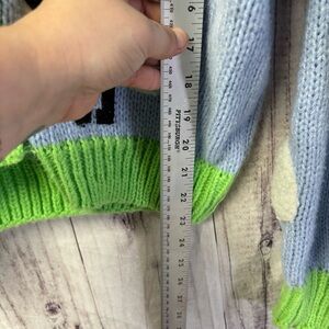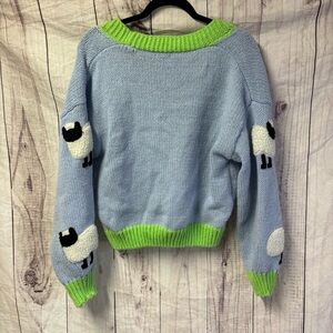 Women's Blue and Green Sheep Embroidered Knit V-Neck Cardigan Sweater Small