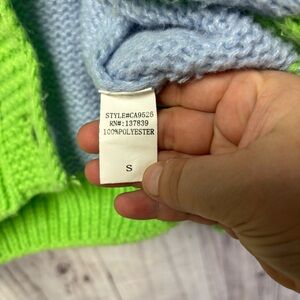 Charming women's sweater featuring a playful sheep design. The blue and green colors add a vibrant touch to your wardrobe.