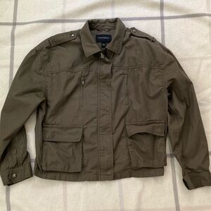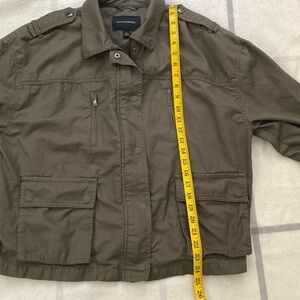 Banana Republic green military jacket. Zip and button closure. Front flap pockets and upper zippered pockets. Button cuffs.