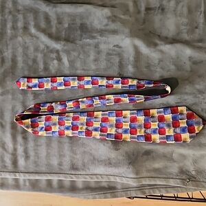 Vibrant tie by J. Garcia. Features a multicolor pattern with red, blue, and cream squares.