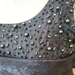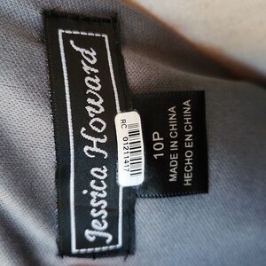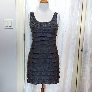 Jessica Howard Size 10P Silver Metallic Ruffle Layered Beaded Chest Sleeveless Dress. Bust is about 18 inches across. See all pictures for actual condition. Feel free to ask questions.