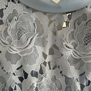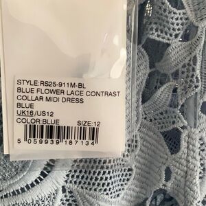 Elegant blue lace midi dress. Floral pattern. Short sleeves. Perfect for special occasions.