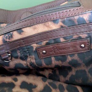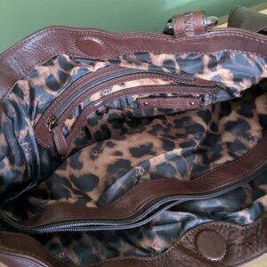 Brown leather purse with copper tone accents. 2 outside side pockets. Multiple inside zipper and compartments. Animal print cloth lining. 16"W x 11.5"H x4.5"W. Dust bag included.