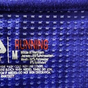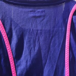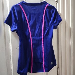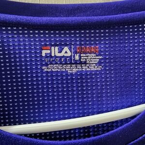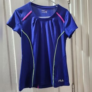 Fila athletic running short sleeved sshirt in vibrant blue with pink and green accents. Perfect for workouts. Has hole in back to weave earbud cords thru. Size Medium. Used but great condition. High low style. Front length 23 inches, back length 25, 17 armpit to armpit, sleeve 6. Mesh back neck & spine & front sides & armpit areas.