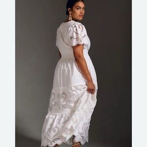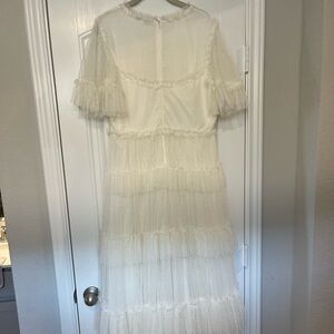This exquisite gown by Ivy City Co is designed for the bride seeking elegance and charm. Crafted in a soft cream white hue, it features a ruffled, tiered silhouette with a sweetheart neckline and flutter sleeves, creating a romantic and ethereal look perfect for a bridal event.