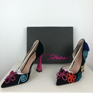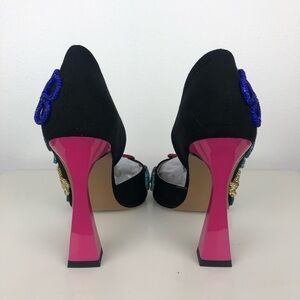 These Betsey Johnson heels feature a striking combination of black suede and vibrant pink accents, creating a bold and artistic statement. The sculptural heel and whimsical floral designs add a playful touch to the classic d'Orsay silhouette. Perfect for those who love to stand out, these shoes are a blend of elegance and creativity. Sold out!