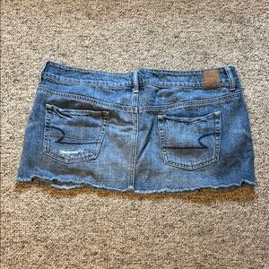 This blue mini skirt from American Eagle Outfitters features a trendy distressed design with a raw hem, perfect for a casual night out. Its medium-wash denim offers a stylish, worn-in look that pairs effortlessly with any top. The skirt's mini length adds a playful touch to your ensemble.